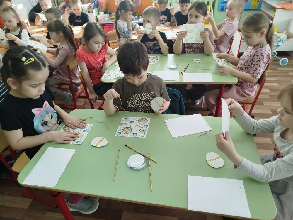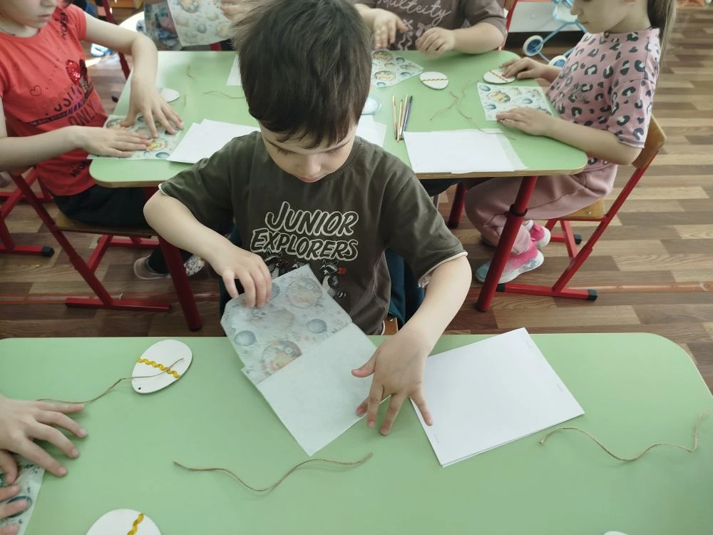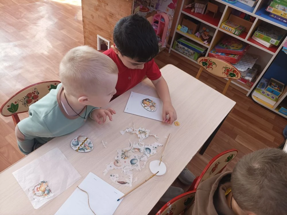 Наши воспитанники с интересом создавали необычные образы на Пасхальных яичках, с помощью бумажных салфеток.